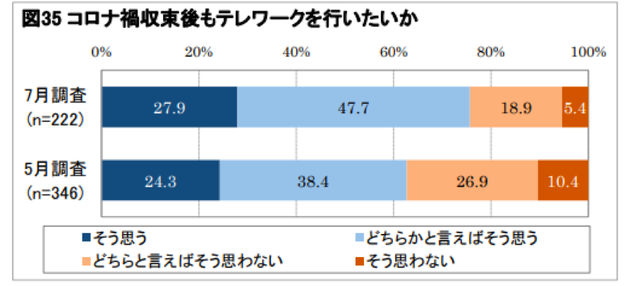 2020年5月および7月に実施された公益財団法人・日本生産性本部 「第2回 働く人の意識調査」では、7月時点でも24.3%がテレワークに否定的(下図)である。