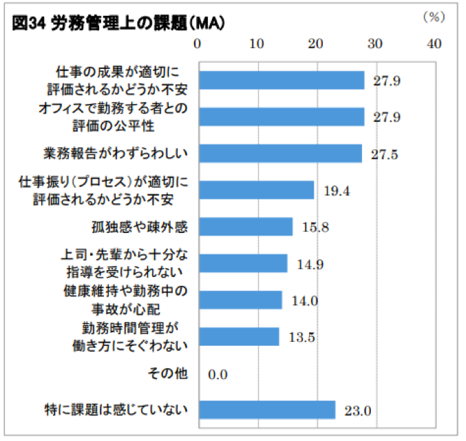 同意識調査では、「適切に評価されるか不安」が27.9%に続き、「孤独感や疎外感」で15.8%、「上司・先輩からの指導を受けられない」は14.9%となり(下図)、ほとんどの人がコミュニケーションに何らかの不安を感じていた。